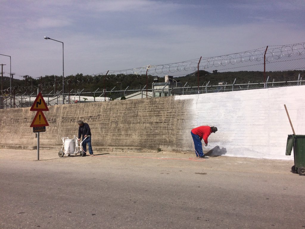 Whitewashing "freedom, liberty" graffiti so @pontifex won't see real situation at #moria camp in #Lesbos pic.twitter.com/QPxbPVyU8r