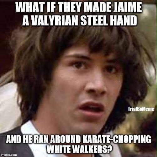 legit. But I still want to see Jaime go all "everybody was Kung Fu fighting" on white walkers,lol