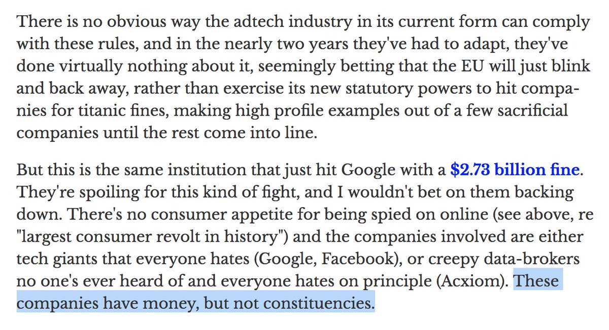 Adtech -- which hoovers up your info and uses it to do millisecond auctions of ads for your eyeballs -- has mere *months* to comply with new, pro-privacy EU rules. Google/etc have done nothing to prepare; they're playing chicken. Will they lose? Possibly: https://boingboing.net/2018/01/09/information-controllers-galore.html … pic.twitter.com/dqx1Ps8ODm