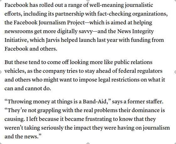 “Throwing money at things is a Band-Aid,” a former Facebook staffer says of the company's funding of journalism projects. “They’re not grappling with the real problems their dominance is causing.” https://www.cjr.org/special_report/facebook-media-buzzfeed.php … pic.twitter.com/Gu5zJCQDQD