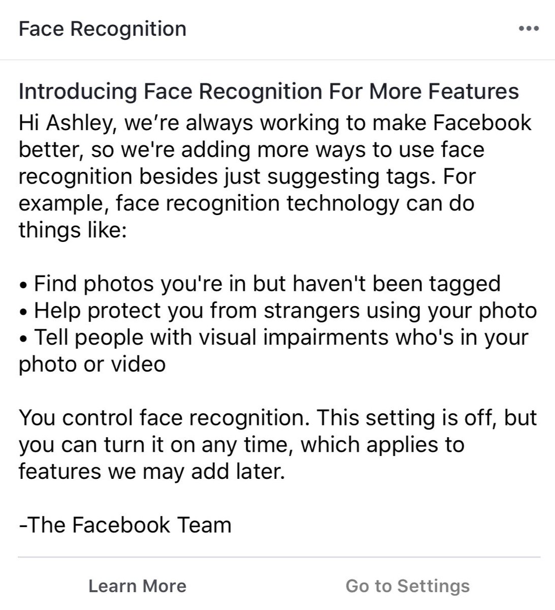 Did you get this notification in your Facebook feed? Here's how to turn off Facebook's face recognition features: http://bit.ly/2F2ncqS  pic.twitter.com/igndUyXIlf