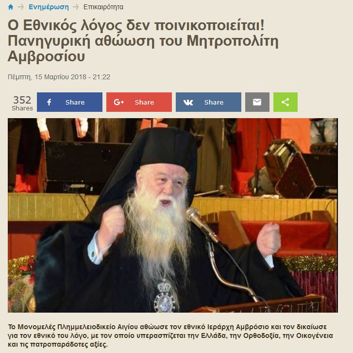 #Greece Bisshop Amvrosios acquitted by court for #HateSpeech. Acquittal was celebrated by #GoldenDawn, who were once called Greece's "sweet hope" by him. pic.twitter.com/9Doq9Hk56I