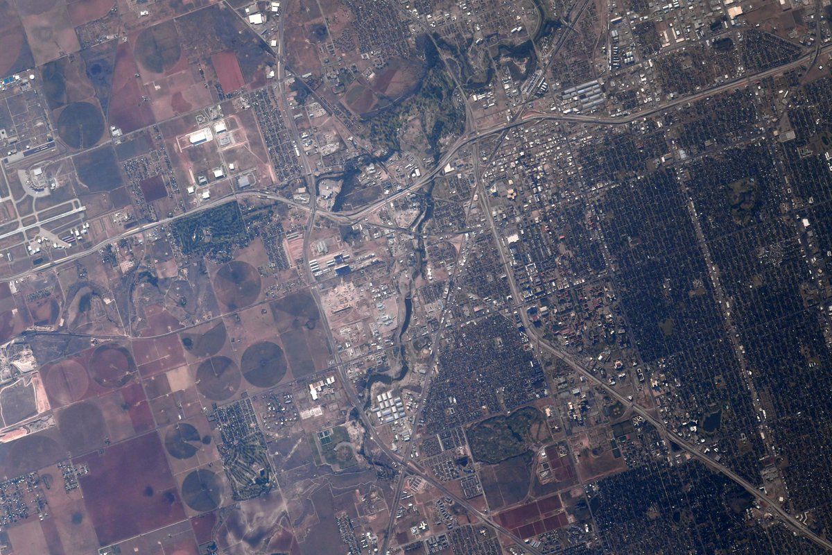 Oil fields, Texas Tech, and the Lubbock Preston Smith International Airport are all visible in these photos. Texas Tech University is visible in the middle right of the first photo. Notice the red roofs of the campus buildings. Can you find the airport?