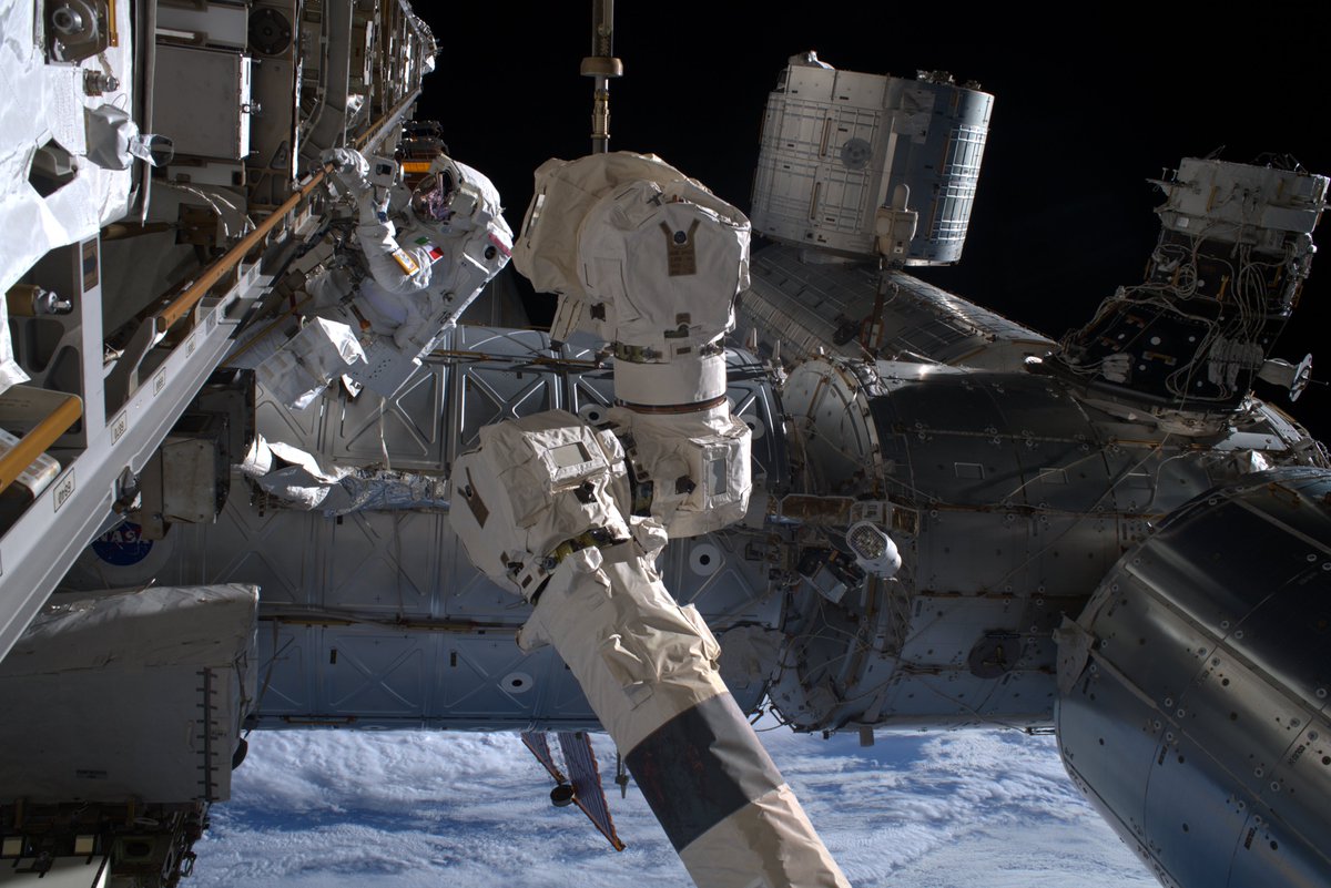 AMS2: the ‘Nadir site’: @Astro_Jessica and @Astro_Christina had to ‘thread the needle’ to position me here with the CanadArm2.
