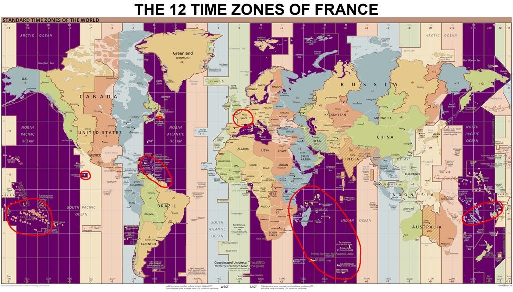 Map shows the 12 time zones of France. Due to their overseas territories France is technically the country with the largest number of time zones. Source: https://buff.ly/2GKof0X pic.twitter.com/9RcIWB0T2C