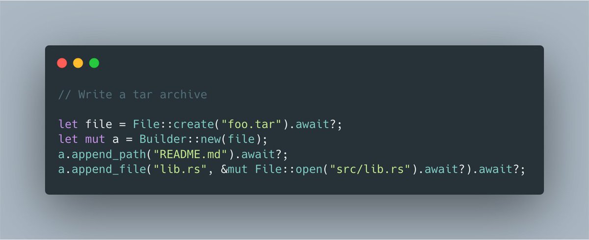 @rustlang@asyncrs tar needs. All based on the great work in https://crates.io/crates/tar https://crates.io/crates/async-tar …pic.twitter.com/XCr4ZkT1fC