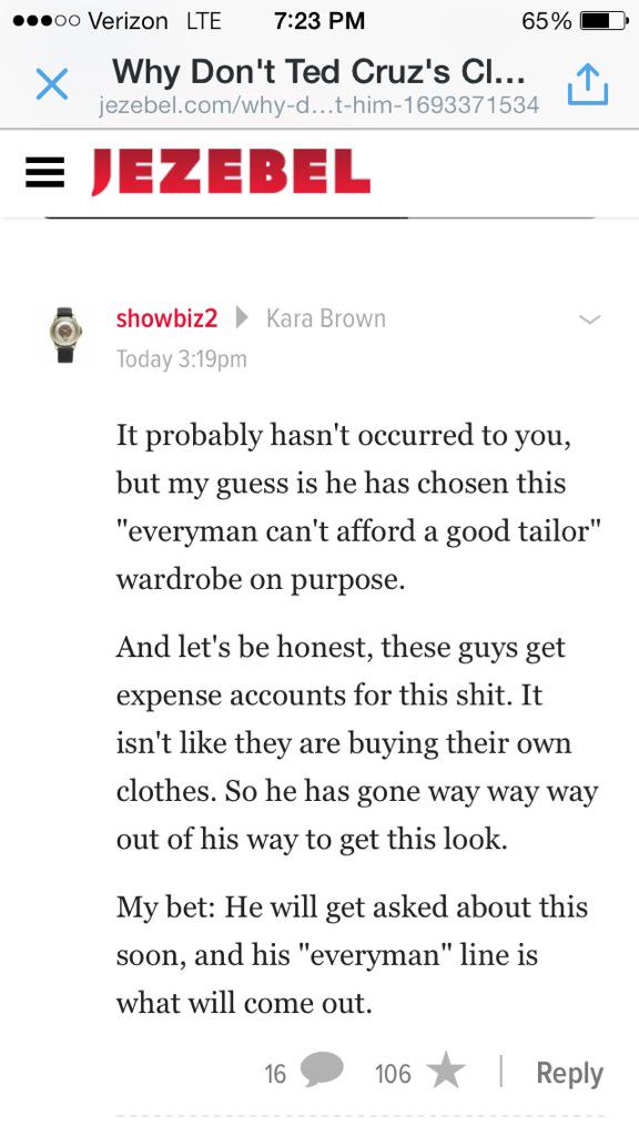 @aterkel: Why don’t Ted Cruz’s clothes fit him? http://bit.ly/1C8vWVD ”Thanks. Twitter will use this to make your timeline better. UndoUndo