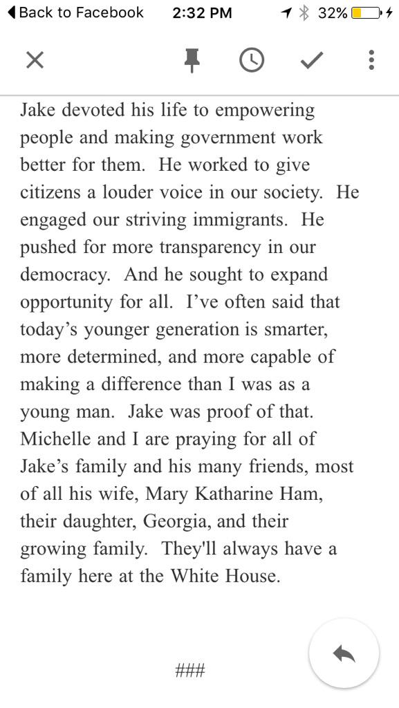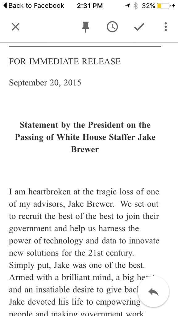 A statement from @POTUS mourning the loss of @jakebrewer. (Those words feel so surreal to type.) pic.twitter.com/11yv9IfJNn