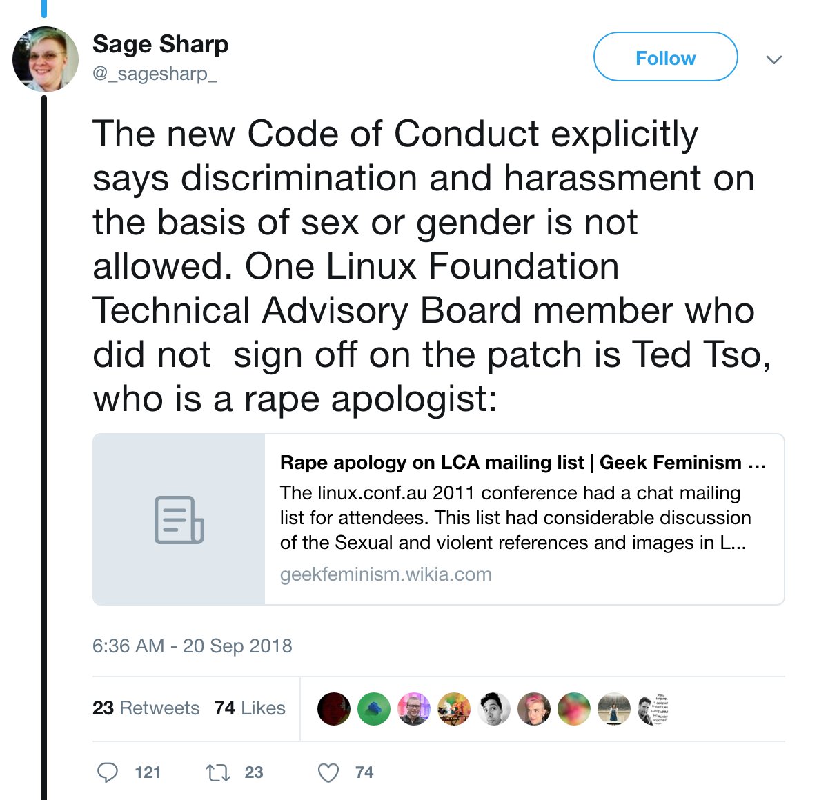 It may seem weird that Tso would discuss rape in an email list for a Linux conf. But for some context, "Jacinta Richardson used published statistics to estimate the proportion of LCA attendees who might be sexual assault survivors". This discussion moved to the mailing list.