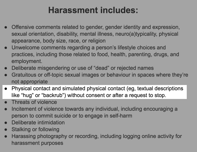 Harassment at @jrdevmentoring includes "simulated physical contact" such as *hugs*pic.twitter.com/Nc77I0dVWw