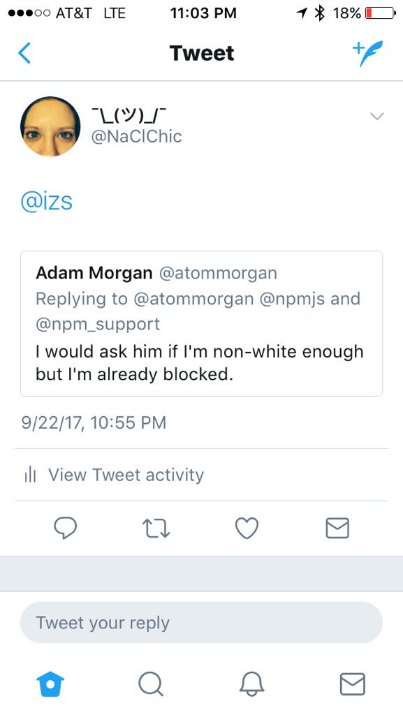 What's a better gauge of the industry's reaction to this? Twitter or Reddit?https://www.reddit.com/r/node/comments/71snxa/npm_ceo_if_you_are_not_a_white_dude_and_have/ …