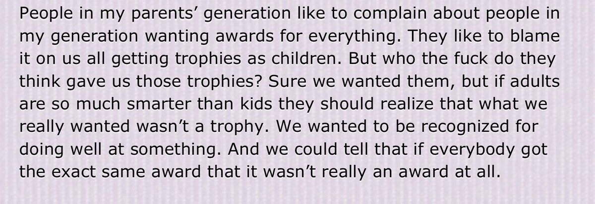 I'm afraid of a world run by people who were never spanked as a kid and given a trophy just for participating.