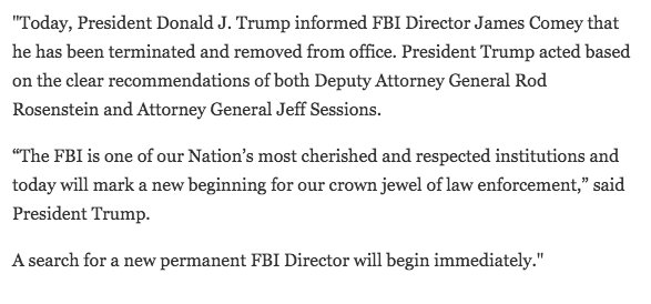 Press secretary's statement on the firing of FBI Director James B. Comey http://lat.ms/2pZPVrd pic.twitter.com/n6u2J1zatt