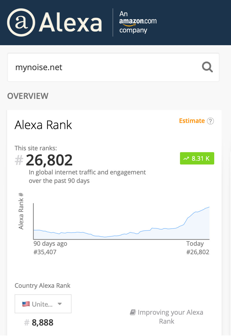 Just reached position #8888 in the US - I like that number! Amazon Alexa monitors website positions between #1 (Google) and #1,500,000,000 (the number of currently active websites in the world)... myNoise is #26,802 worldwide.pic.twitter.com/fLtOS87KXX