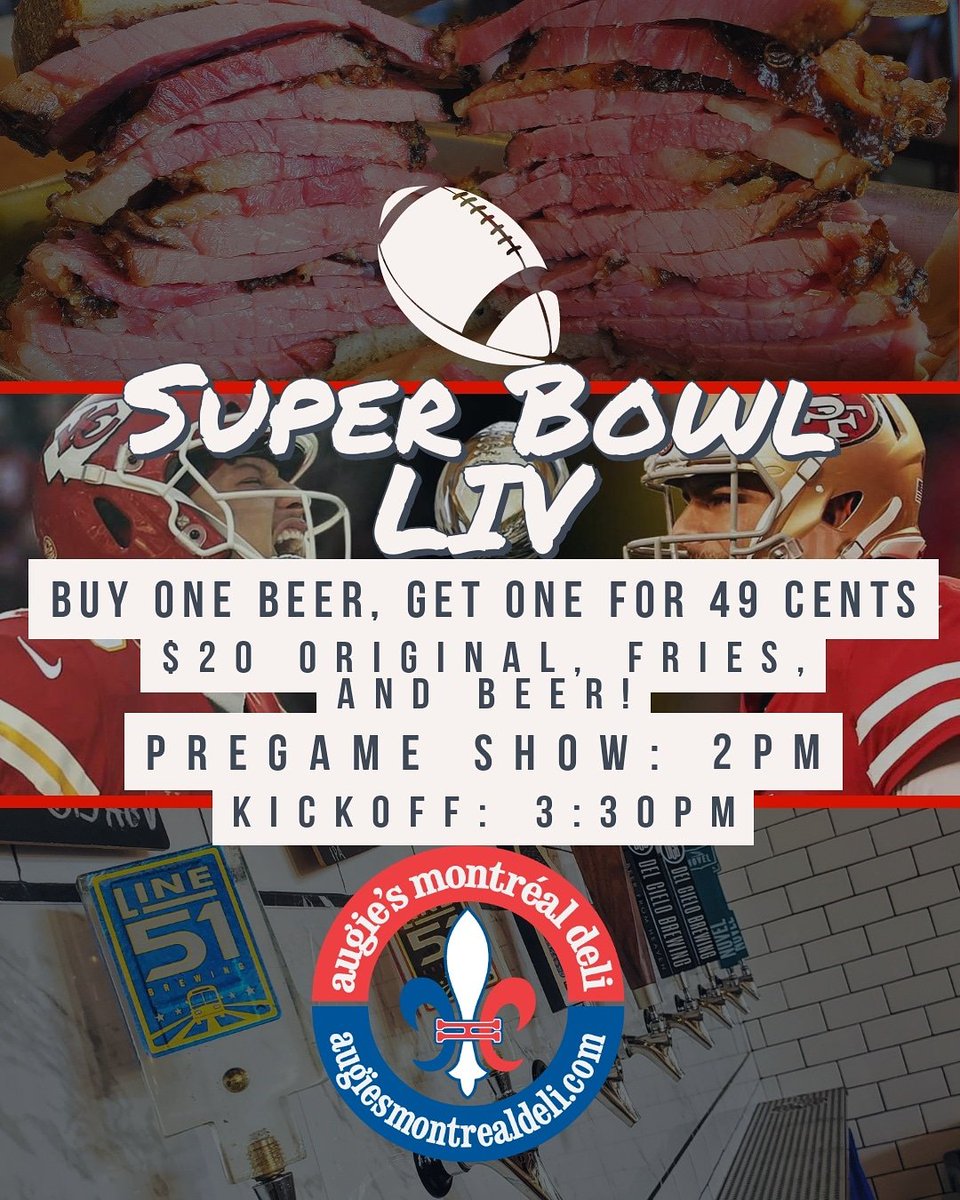 Another great deal for Superbowl LIV! In honor of the San Francisco 49ers, Get one beer get another for just 49 cents! Yes you read that right, just 49 cents! Come make Augies Montreal Deli your place to watch the game!
