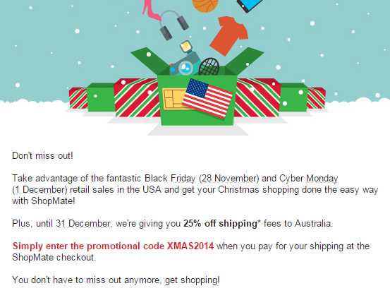 Take advantage of @auspost's SHOPMATE offer for some Black Friday and Cyber Monday shopping in the States ;-)pic.twitter.com/TdLg2vzVYg