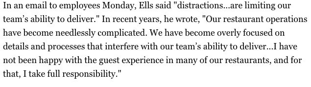 Chipotle CEO Steve Ells emails employees this AM writing chain ops have become "needlessly complicated" https://www.fastcompany.com/3066502/chipotle-shakes-up-its-leadership-team-co-ceo-moran-to-step-down-soon …