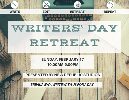 Take a day and get back to what's important - writing! Join us @StudiosRepublic for the first Writers Day Retreat of the New Year and finish up that project you've been working on. You deserve it: http://bit.ly/2GTrhmu pic.twitter.com/puXwEjHf88