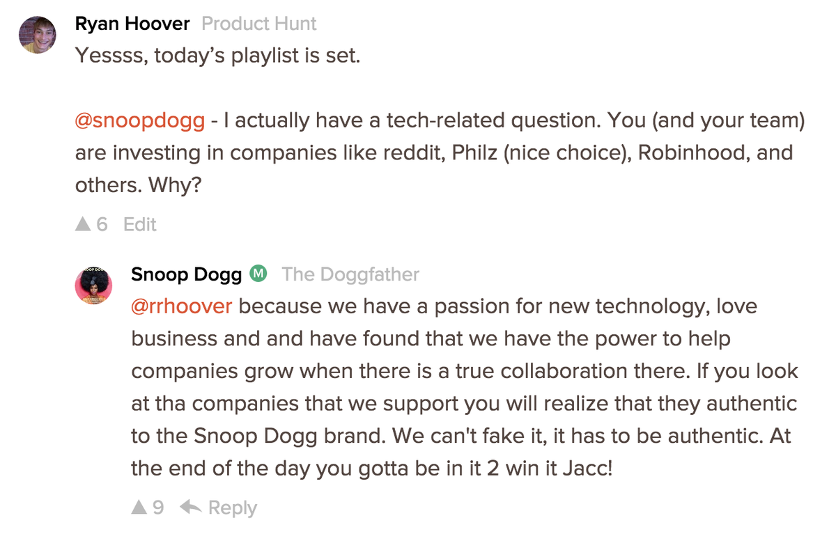 @ProductHunt and get some startup tips from@SnoopDogghttps://twitter.com/rrhoover/status/598139344822607873 …
