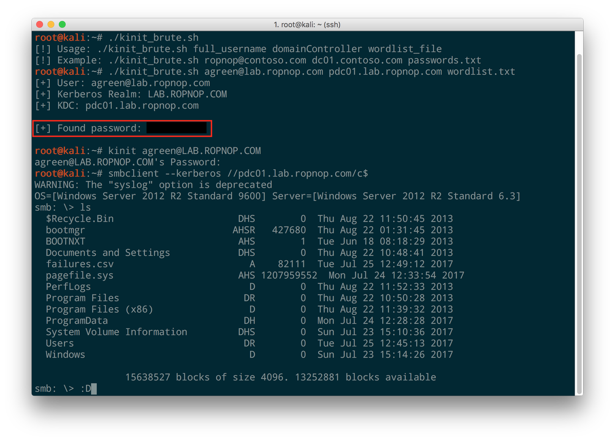 Kerberos TGT bruteforcing. Cycled through 5000 passwords, no lockouts, and no Failure logs :) script available here: https://git.io/v7nwq pic.twitter.com/VSJ2Je5rYU