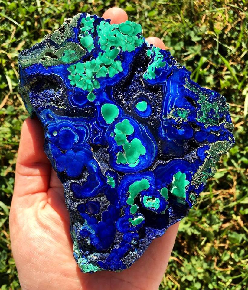 This is perfect specimen of Azurite and Malachite. The two minerals sometimes occur admixed or banded together, forming what is called "Azure-malachite" Photo: New Moon Beginnings