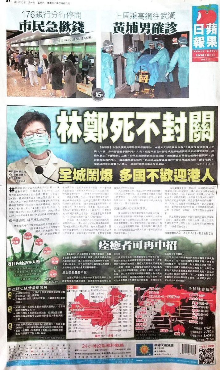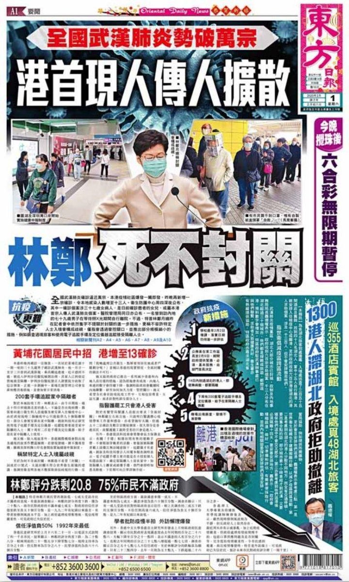 A sign of the consensus around the demand to close the border: Front pages of pro-democracy Apple Daily (L) & pro-CCP Oriental Daily (R) use the exact same words in their headlines: 'Carrie Lam would rather die than close the border.' Both papers are critical of