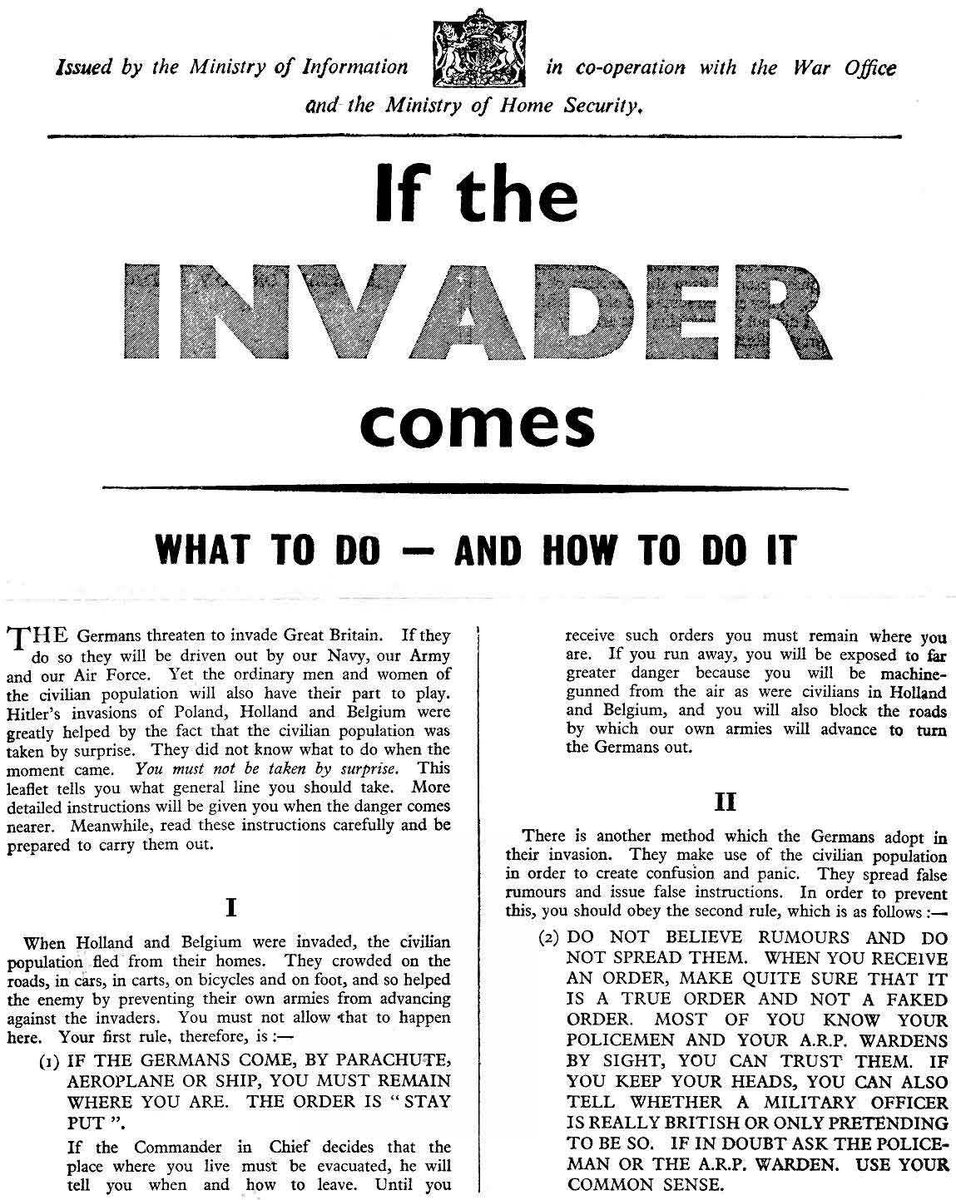 British government has printed 15 million copies of a leaflet named "If the invader comes", issued to every household in Britain to prepare them for a German invasion.pic.twitter.com/6T2uUDQmSs