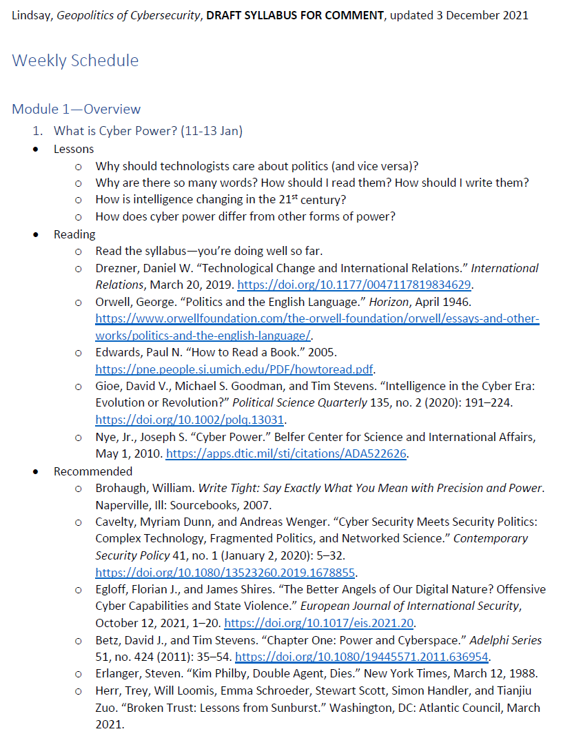 I've finished a draft syllabus for my @GaTechCyber seminar on the GEOPOLITICS OF CYBERSECURITY this Spring. We'll explore the strategic and organizational context of cyber campaigns. Send any comments, suggestions, or tomatoes my way. https://bit.ly/3DkTESv pic.twitter.com/hmHMw6XHyd