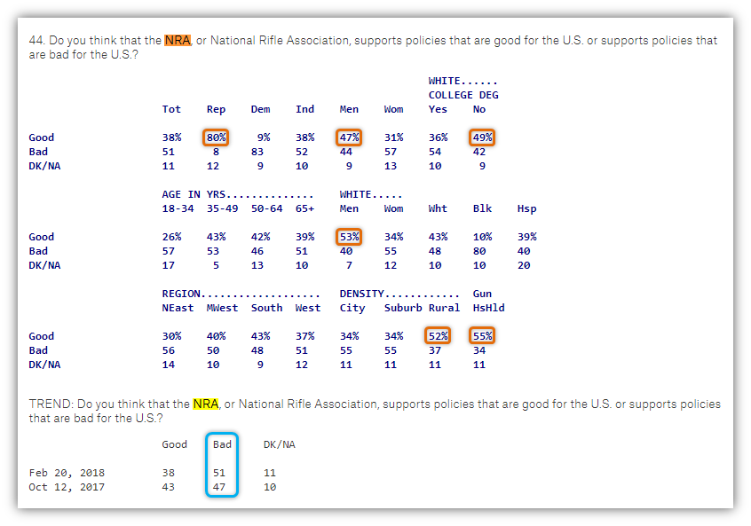 A radical switch in NRA's brand, now viewed unfavorably by a majority of Americans. "Supports policies that are bad for the U.S." Does it matter? No. See the orange boxes. Republicans: 80% Good opinion. White College No Degree: Good. Rural: Good. They all vote. You don't.pic.twitter.com/aaEKgV14MB