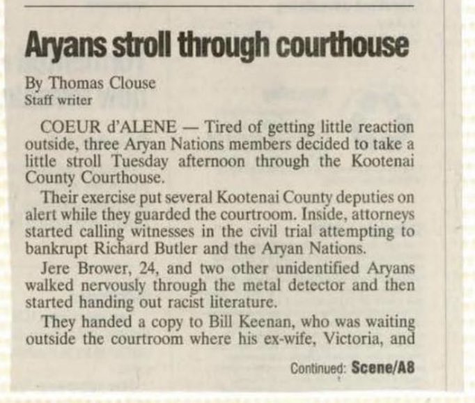 More important to note about Jere is his history of Nazi organizing and active membership. Here’s an August 2000 newspaper article placing him at the Kootenai County Courthouse during a lawsuit to bring down the Richard Butler and Aryan Nations. The article describes he and...pic.twitter.com/MZCek9dZpw