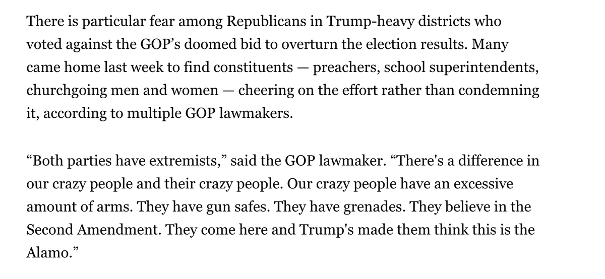 Republicans have transitioned remarkably quickly from "I can vote in this inflammatory way because our supporters aren't violent" to "I have to vote in this inflammatory way because our supporters are violent" https://www.politico.com/news/2021/01/11/lawmakers-fear-violence-captiol-riots-457868 …pic.twitter.com/49EP7nm7mf