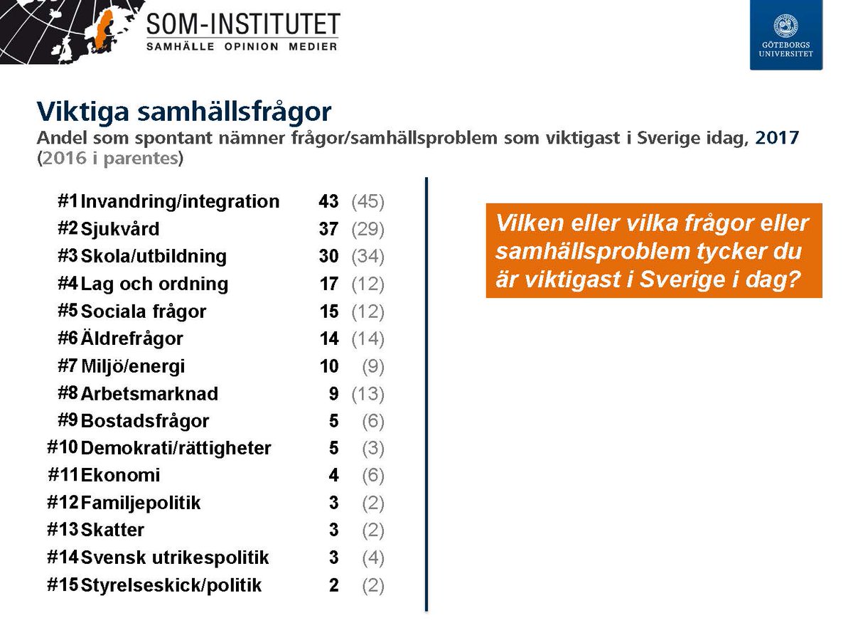 Men är det verkligen så? När man explicit frågar om vad som är viktigast (inte oroande!) så ser det helt annorlunda ut, & mer i linje med hur rapporteringen ser ut. Orosfrågan är ju en där man _måste_ ta ställning till ett antal olika alternativ. Tror de diskuterar diskrepansen >pic.twitter.com/RV0GFMfoWY