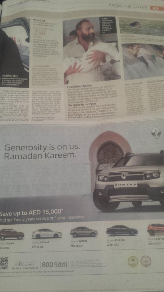 250 Pakistanis die from heat wave and electricity cuts. Meanwhile ad says be generous in #Ramadan and buy a car #failpic.twitter.com/vVF6B9dbRR