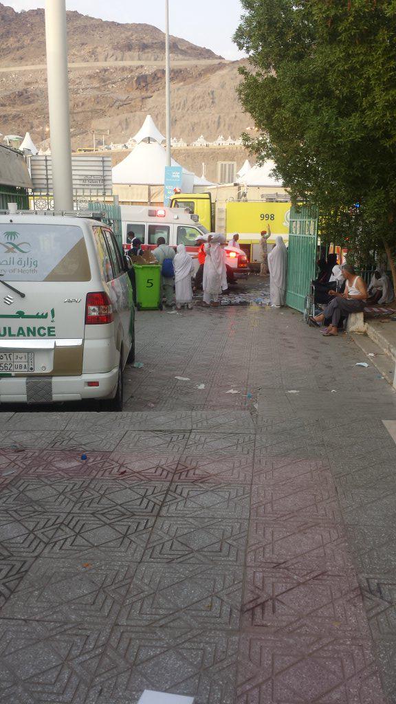 A few meters from the stampede in #Mina and ambulances still ferrying bodies out. Death toll over 700 to rise. #hajjpic.twitter.com/wgRbigSiXl