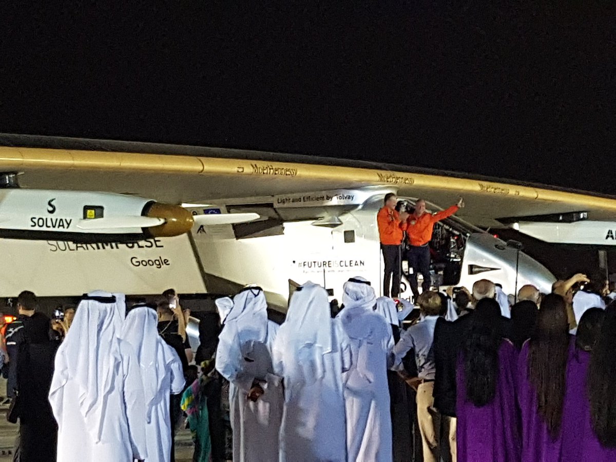 Swiss #solarimpulse pilots pump fists in victory after Abu Dhabi landing, ending first round the solar world flightpic.twitter.com/aoUB0Uo1d2