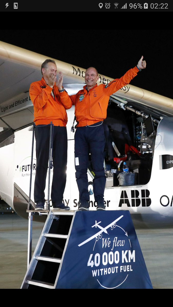 Happy moments by Swiss pilots @bertrandpiccard @andreborschberg from today's #solarimpulse landing #FutureIsCleanpic.twitter.com/cIN6vrYXZ4