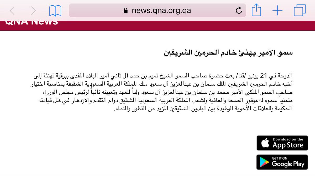 #Qatar's Emir Tamim has congratulated King Salman for naming his son as crown prince. It's the new crown prince who's led isolation effortspic.twitter.com/CWIJZASwaC