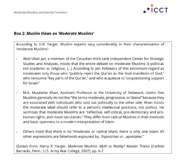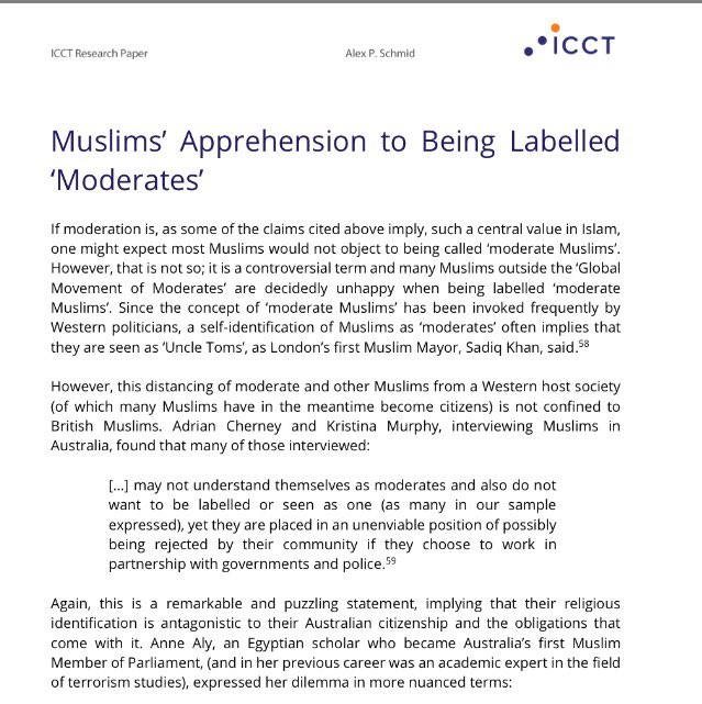 This is it: 'Many Muslims nevertheless do not like to be called ‘moderates’ for fear of being seen as pro-Western. https://icct.nl/publication/moderate-muslims-and-islamist-terrorism-between-denial-and-resistance/ …