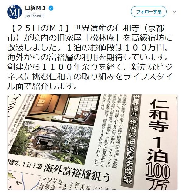 徒然草でおなじみの仁和寺の法師、料理人を349日連続で働かせて訴えられて敗訴したと思ったら、今度は富裕層向けに1泊100万円の高級宿坊をオープンする模様。神も仏もないとはこのことだなpic.twitter.com/QDyO97ORS7
