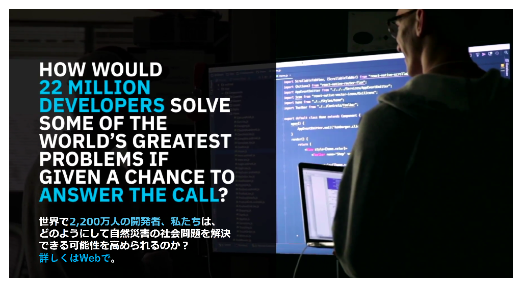 世界で2,200万人の開発者、私たちは、どのようにして自然災害の社会問題を解決できる可能性を高められるのか?まずは「Call for Code(コールフォーコード)」を是非、覚えてください。詳しくはWebで。