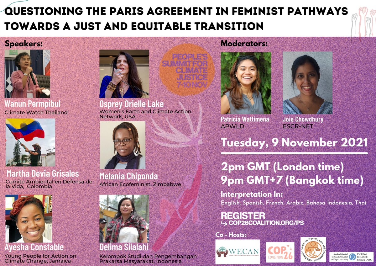 #ParisAgreement. But is the Agreement itself just and equitable? In this conversation we question this & examine feminist pathways for solutions to the#climatecrisis#COP26@WECAN_INTL@ESCRNetpic.twitter.com/pmhYrBnVpE