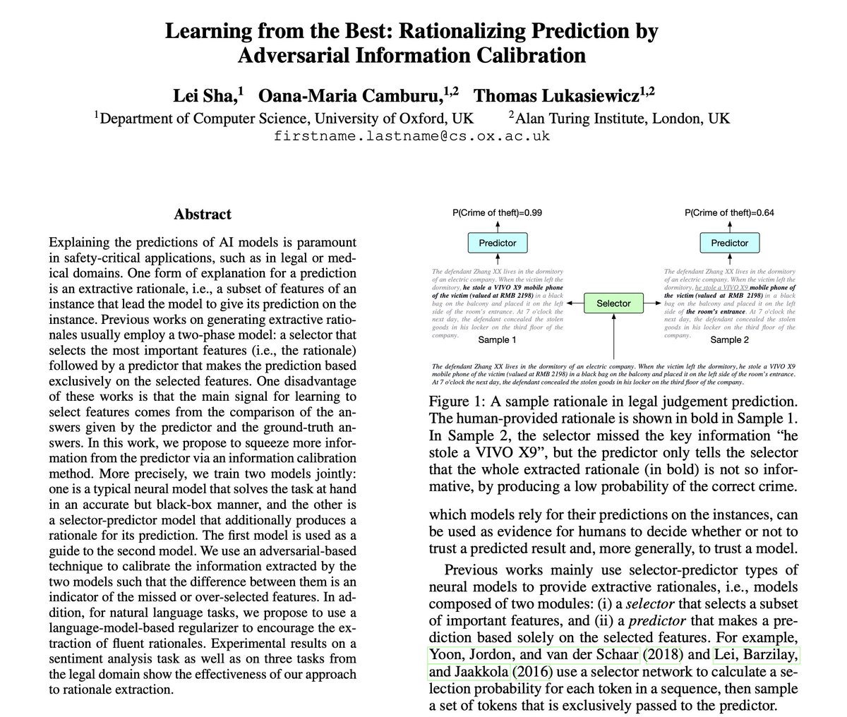 Black-box DNN model isn’t reliable for legal judgments & medical diagnostics. (Can’t guarantee safety). But Interpretable DNNs could increase the reliability of neural models. 1) adversarial to rationale extraction for neural predictions 2) language-model-based regularizerhttps://twitter.com/oanacamb/status/1357041022333833219 …