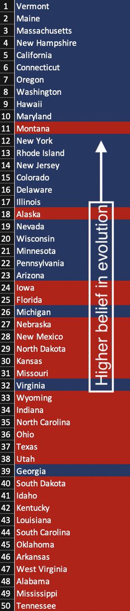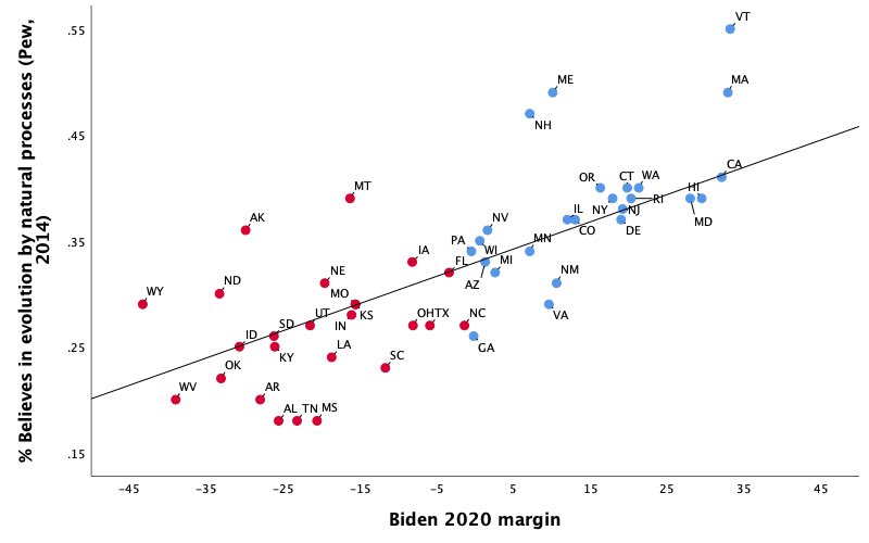 Just because I’ve done this for the last few elections, here’s this year’s Evolution Index. State-level belief in evolution correlated with Biden’s vote margin at r=.77 (a number that has only grown since last time) (1/n)pic.twitter.com/xVdcs0Xggi