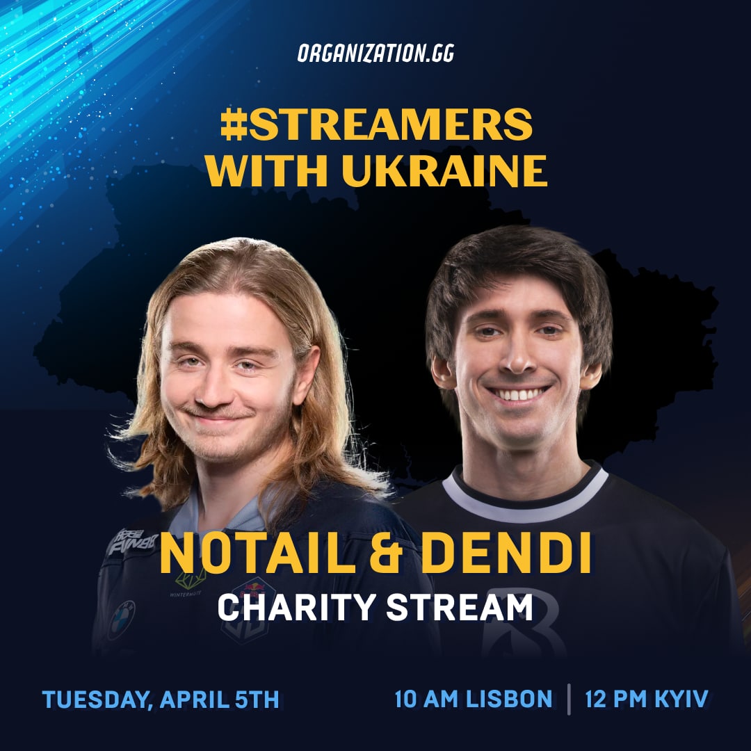 @DendiBoss and@OG_BDN0tail are streaming together for#StreamersWithUkraine at http://twitch.tv/dendi The idea behind is to entertain you and collect money for Humanitarian needs. Donate here https://charity.orgz.gg/QdJ2dO pic.twitter.com/rtNOozNYza