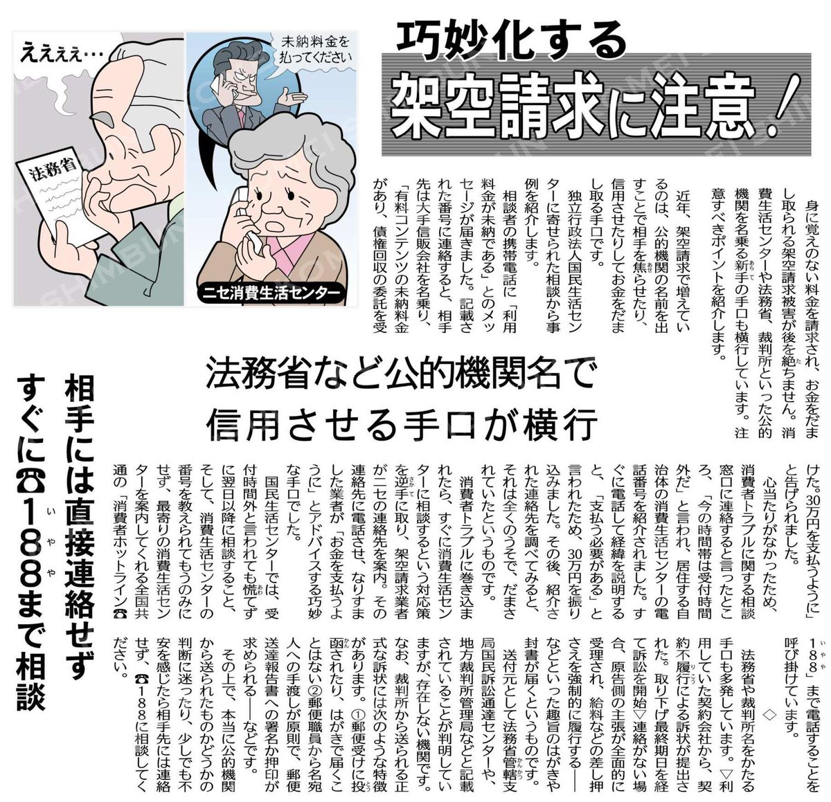 (シニアくらぶ)巧妙化する架空請求に注意!/法務省など公的機関名で信用させる手口が横行