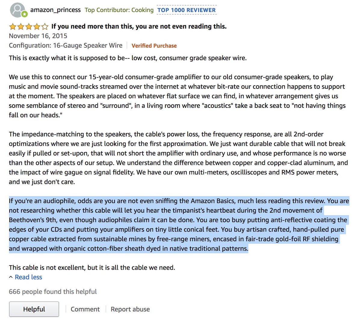 Buying speaker wire from Amazon. Can't stop laughing at how every other reviewer clearly NEEDS to express their disdain for audiophiles lolpic.twitter.com/bwBVzUOpmE
