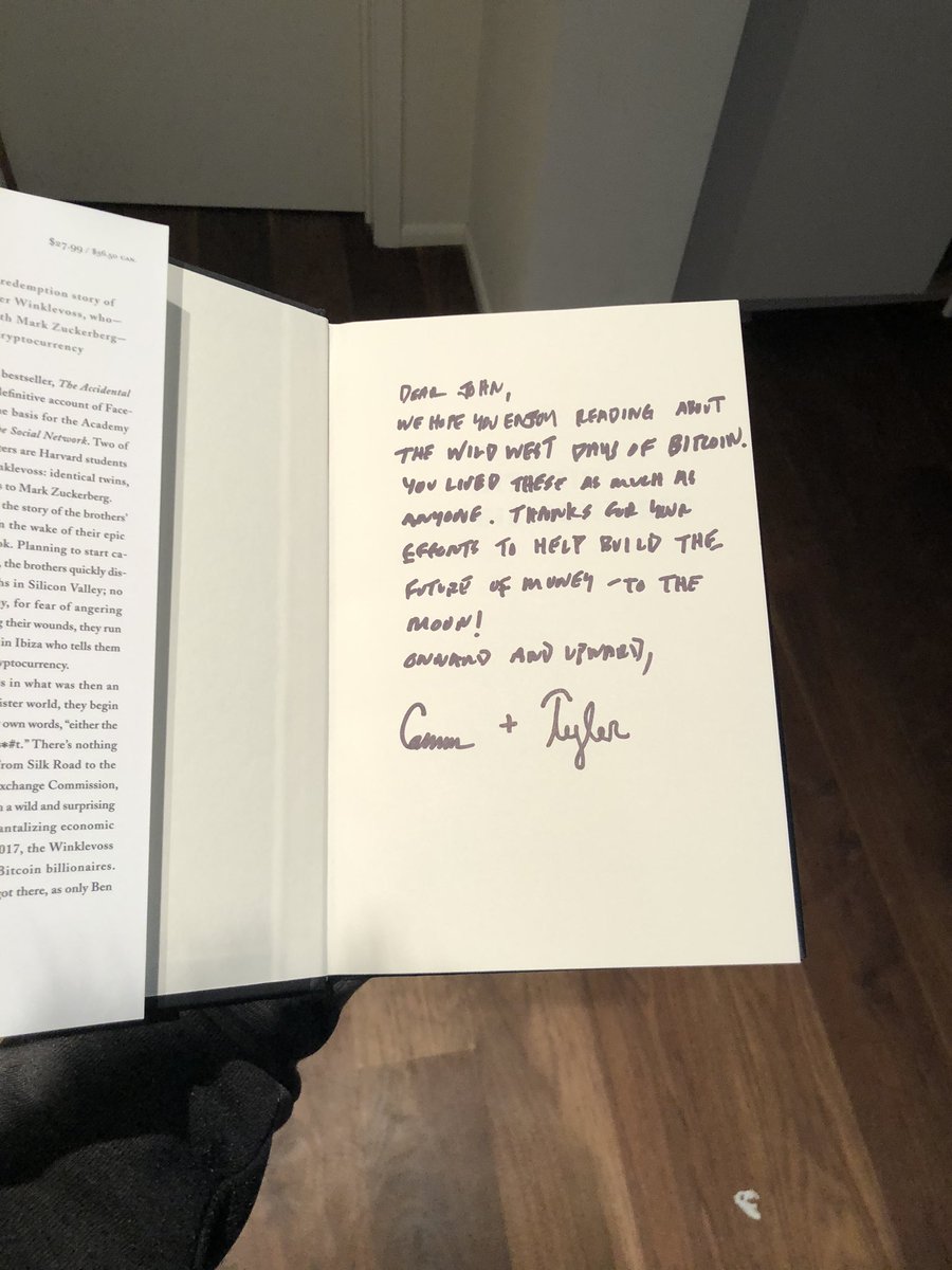 @winklevoss and@tylerwinklevoss were some of the first people to take me seriously back then. Meant a lot. Thanks for the book guys! Really appreciate the nice note