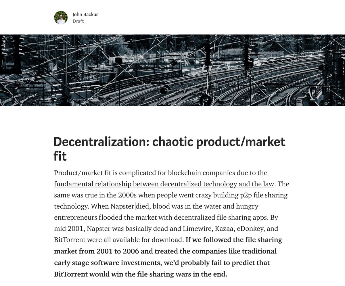 Started a blog post ~3w ago on parallels between p2p revolution and blockchain today. So much here. I’m up to like 5 half-finished posts now