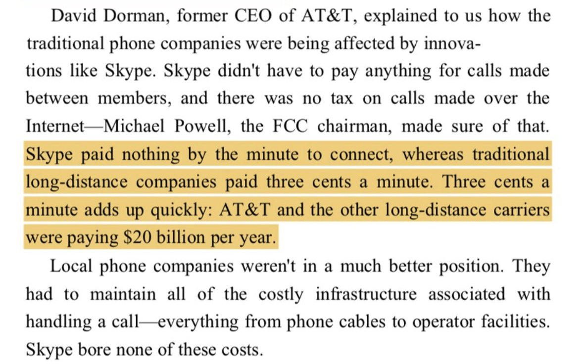 Technically it's a bit more complicated : telephone companies used protocol that required setup and lease (!!!) of communication channel between callers. Having lease provided throughput guarantees. Skype used protocol (internet) based on "best effort" no guarantees...