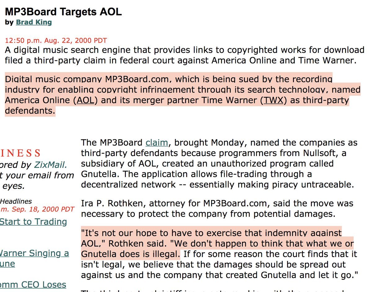 > AOL Employee: Introducing Gnutella, a Napster replacement! > AOL Executive: NO! Take it down! Few months pass. mp3 search company "MP3Board" uses Gnutella; gets sued by RIAA > MP3Board Lawyer: … AOL built this. If you sue us, you should sue them too > AOL Executive: Damn it!pic.twitter.com/ZQTG0VOsXu